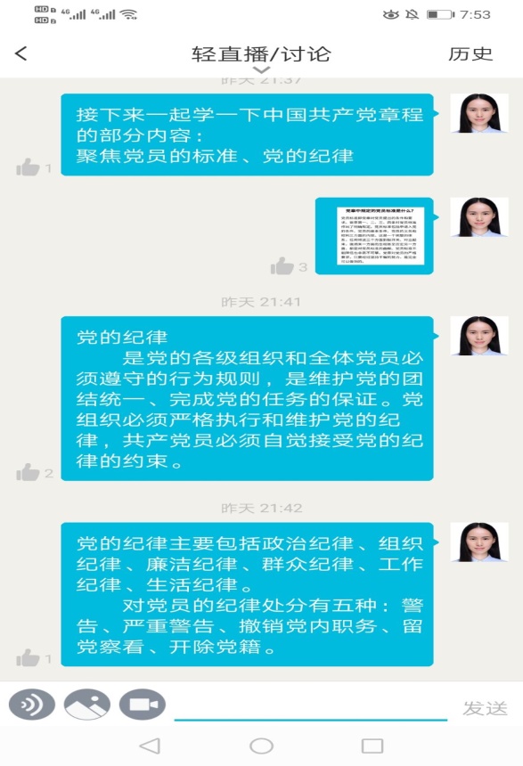 支部宣传委员高婵将《中国共产党章程》的部分内容,上传到云班课,全体党员进行学习,就学习的内容,全体党员一起进行讨论,重点学习党员的标准、党的纪律。最后高老师指出,作为一名党员,应该严格遵守党员标准,牢记党的宗旨,严守党的纪律,全心全意为人民服务,从自身做起,发挥先锋模范作用和骨干带头作用。