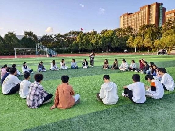 - 2024 年 10 月 12 日下午,阳光洒在绿茵茵的足球场上,至善社区23本科汉语言1班一场别开生面的丢手绢和唱歌活动在此欢乐开展,为这个平凡的秋日午后增添了一抹亮丽的色彩。 阳光温柔地洒在绿茵场上,同学们围坐成一个紧密的圆圈,开启了欢乐的丢手绢之旅。由于没有手绢,我们借用了一位同学的小水瓶来代替,手拿水瓶的同学如灵动的小鹿般在圈外奔跑,水瓶在他手中仿佛变成了传递欢乐的使者。大家的目光紧紧相随,既紧张又兴奋,期待与忐忑交织。一旦有人发现水瓶在自己身后,便立刻起身追逐,足球场上回荡着他们的欢声笑