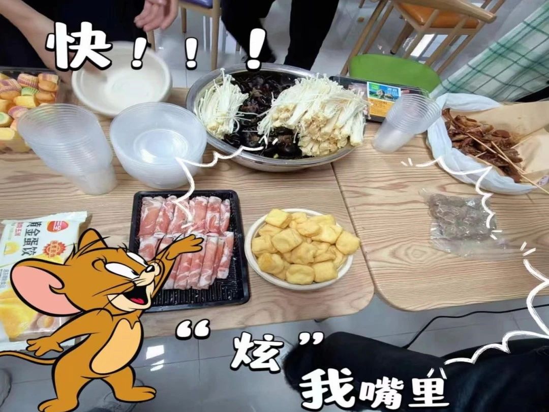 - 时间如流水,转眼间已入秋?!白怨欧昵锉帕?,我言秋日胜春朝?!弊怨盼娜硕啾?,可是秋天,天气转凉,不正也是大家欢聚一起涮火锅的好时节么?“金樽清酒斗十千,玉盘珍羞值万钱。”大家一起共享美食的时光,千金也难换。10 月 11 日,至善社区23本科汉语言3班的“火锅盛宴”在学生公寓共享厨房热烈展开?;疃殖?,同学们热情高涨,纷纷化身小厨师,一展身手。从食材的准备到烹饪的过程,大家分工明确,配合默契。有的同学负责洗菜切菜,一丝不苟地处理着各种新鲜食材;有的同学则担当起大厨的角色,熟练地翻炒、调味,阵阵