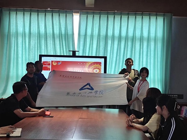 由艺术与传媒学院院长农伟和常务副院长张程为小分队授“艺术与传媒学院”院旗,由艺术与传媒学院党总支副书记韩路和办公室主任张婷婷为小分队授暑期“三下乡”队旗。